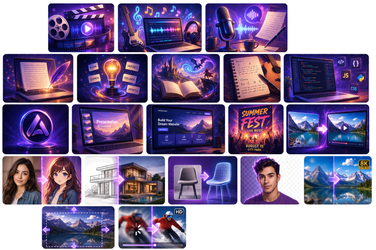 Generera bilder, skriv text, bygg logotyper, komponera musik och mer — gratis, direkt i din webbläsare.